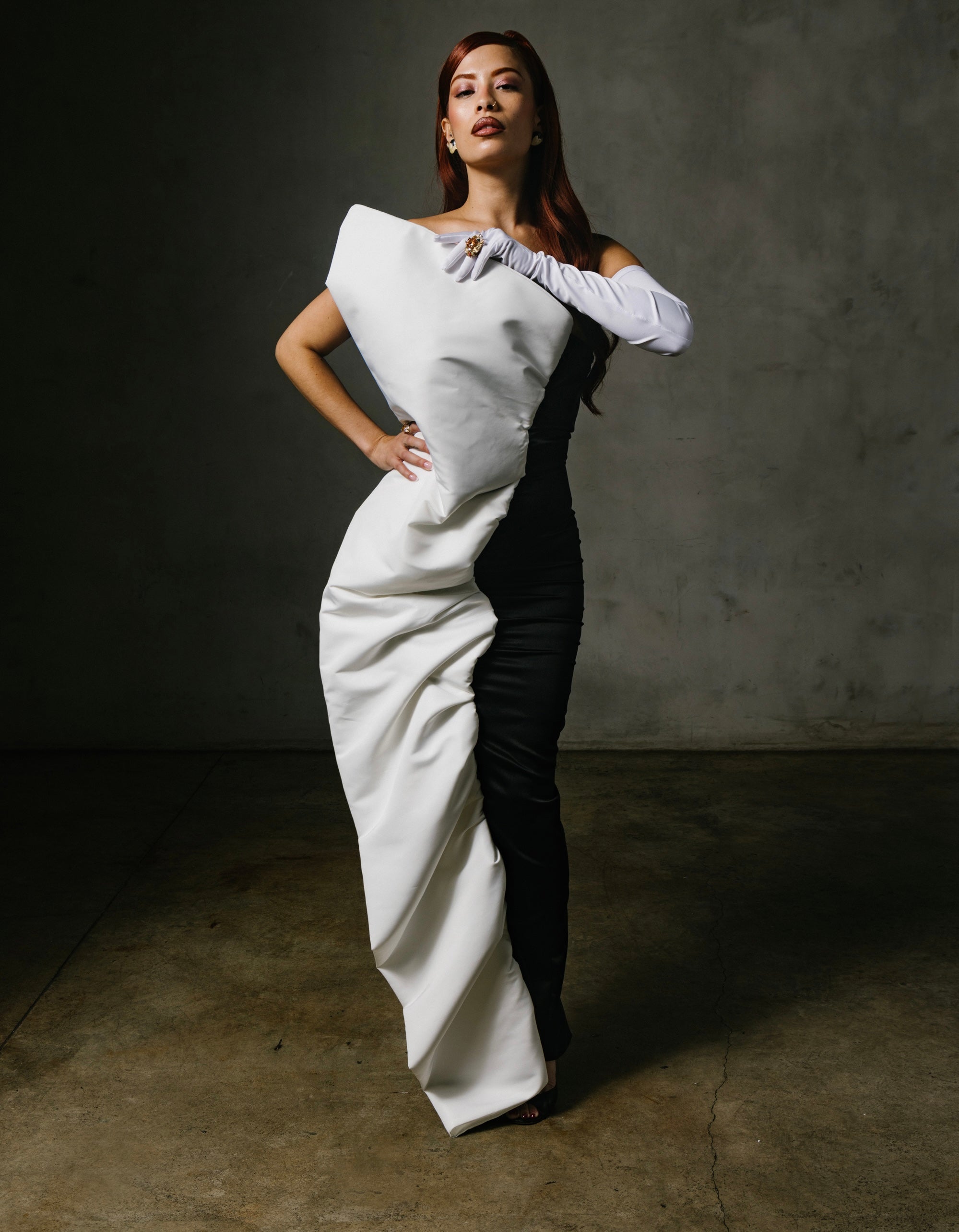 Capture the essence of style with Kelsey Ashley, a prominent celebrity stylist, modeling a bespoke Belle Massacre gown in a stunning campaign shoot.